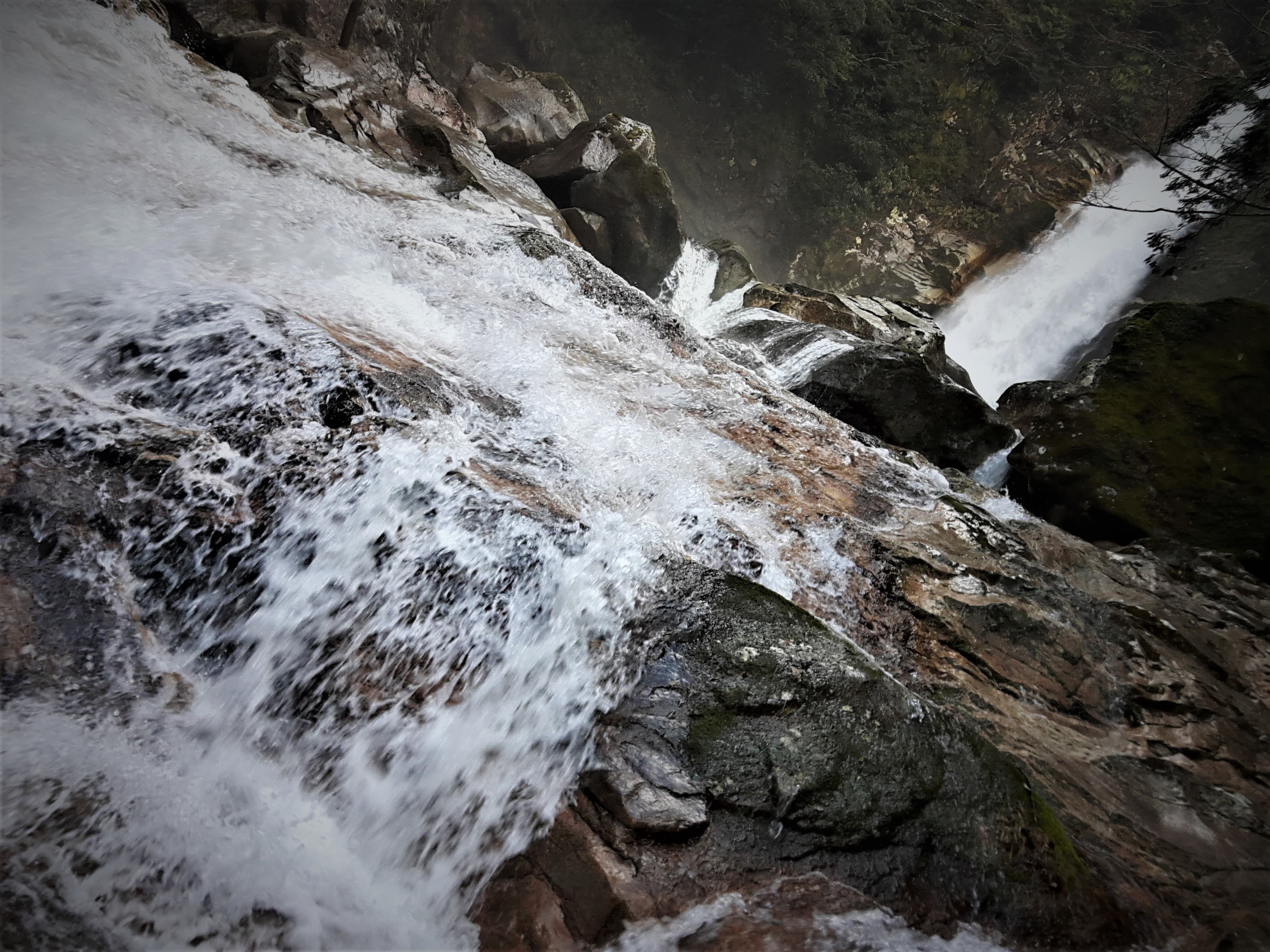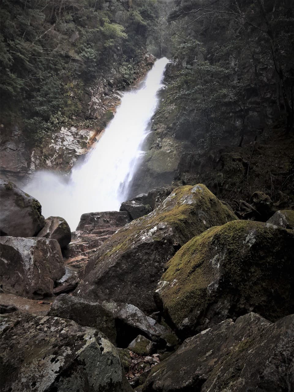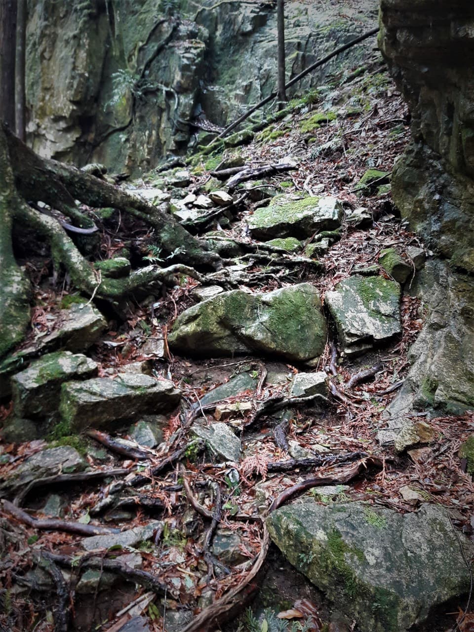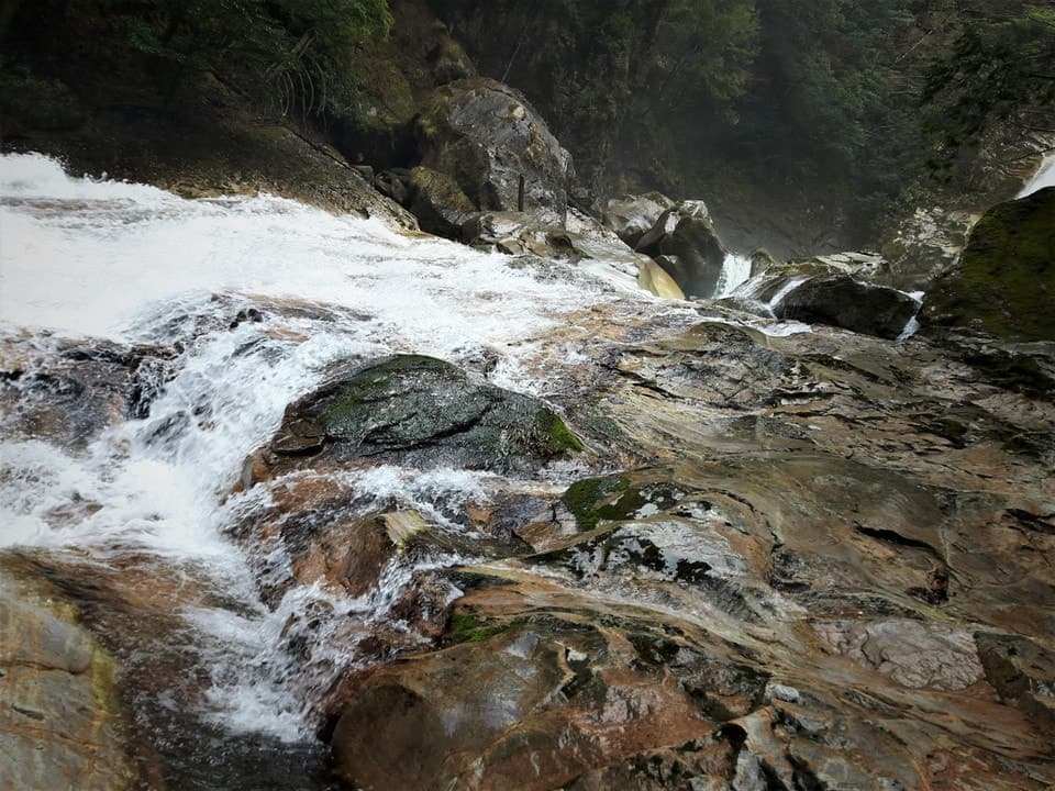ここから滝までの道のりはかなり足場が悪く、途中、大きな岩の間をくぐり