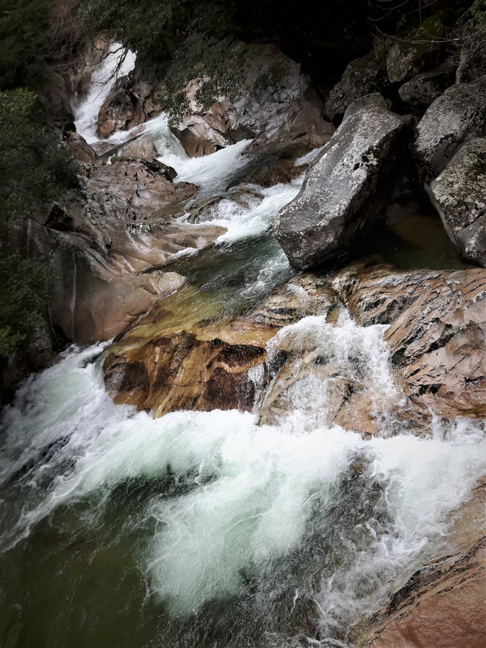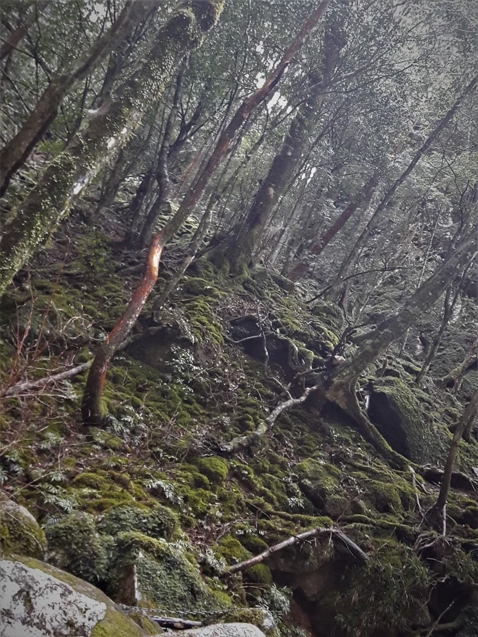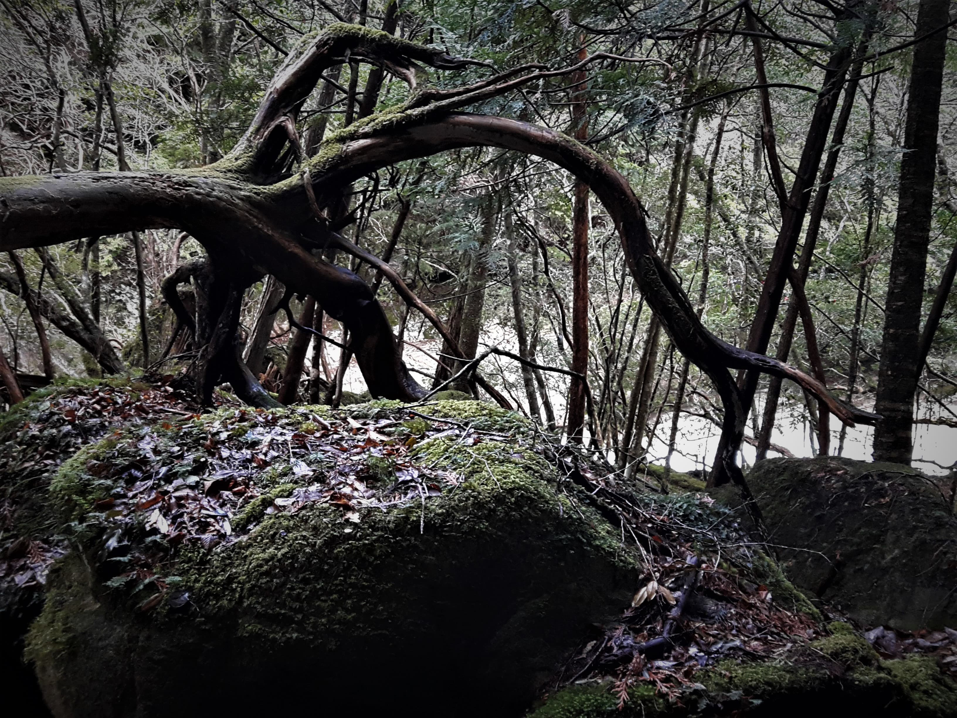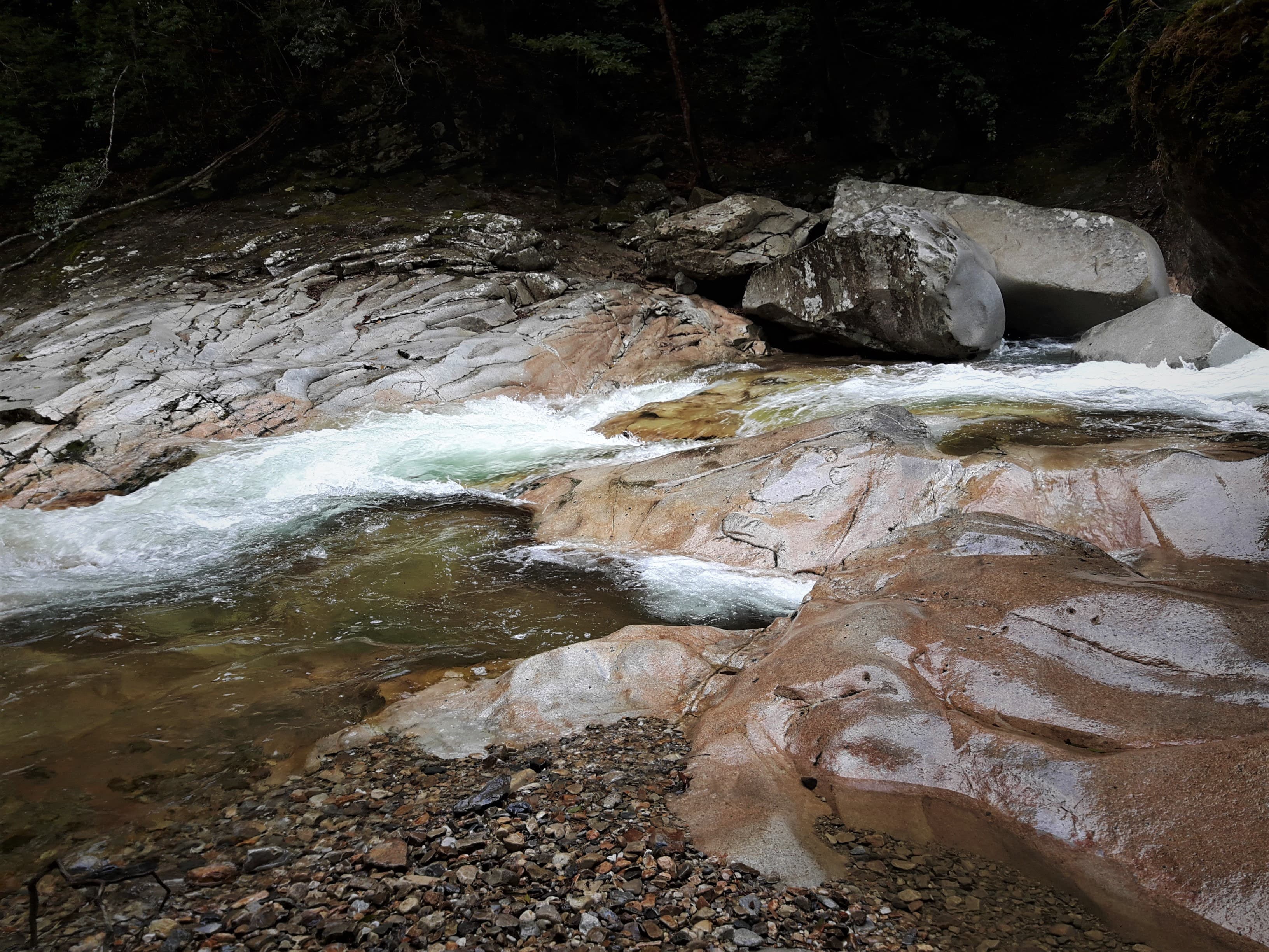 ここから滝までの道のりはかなり足場が悪く、途中、大きな岩の間をくぐり