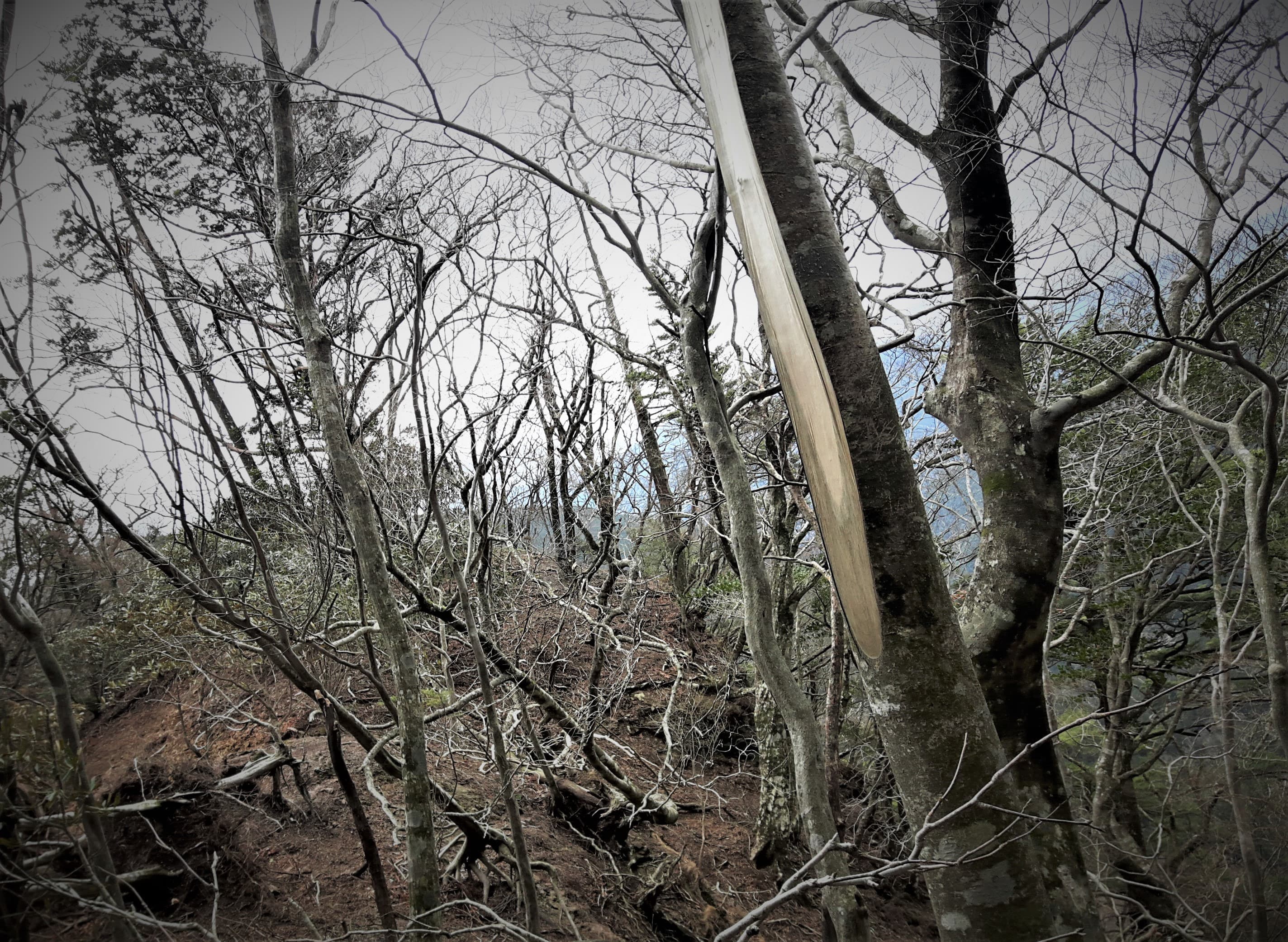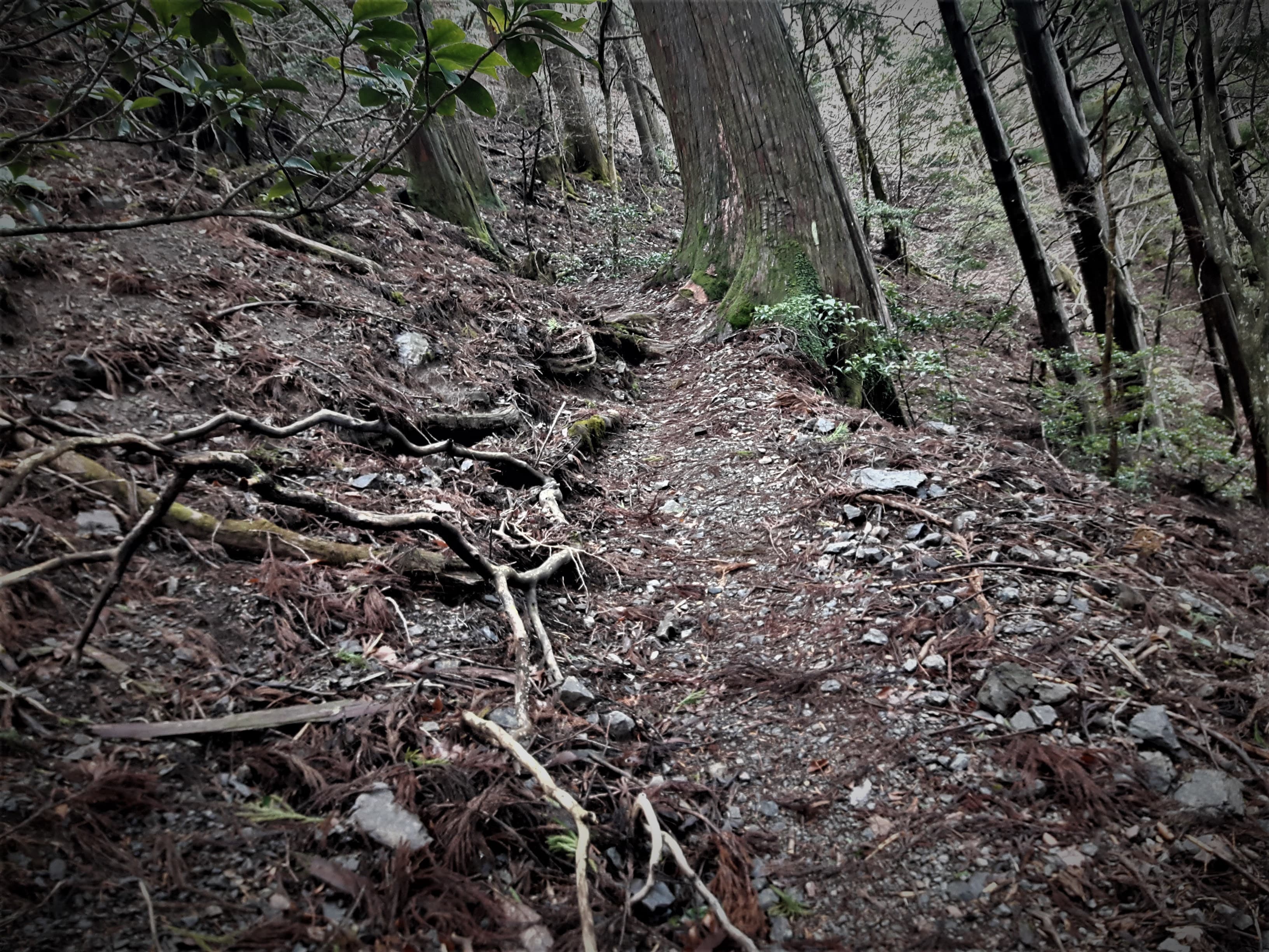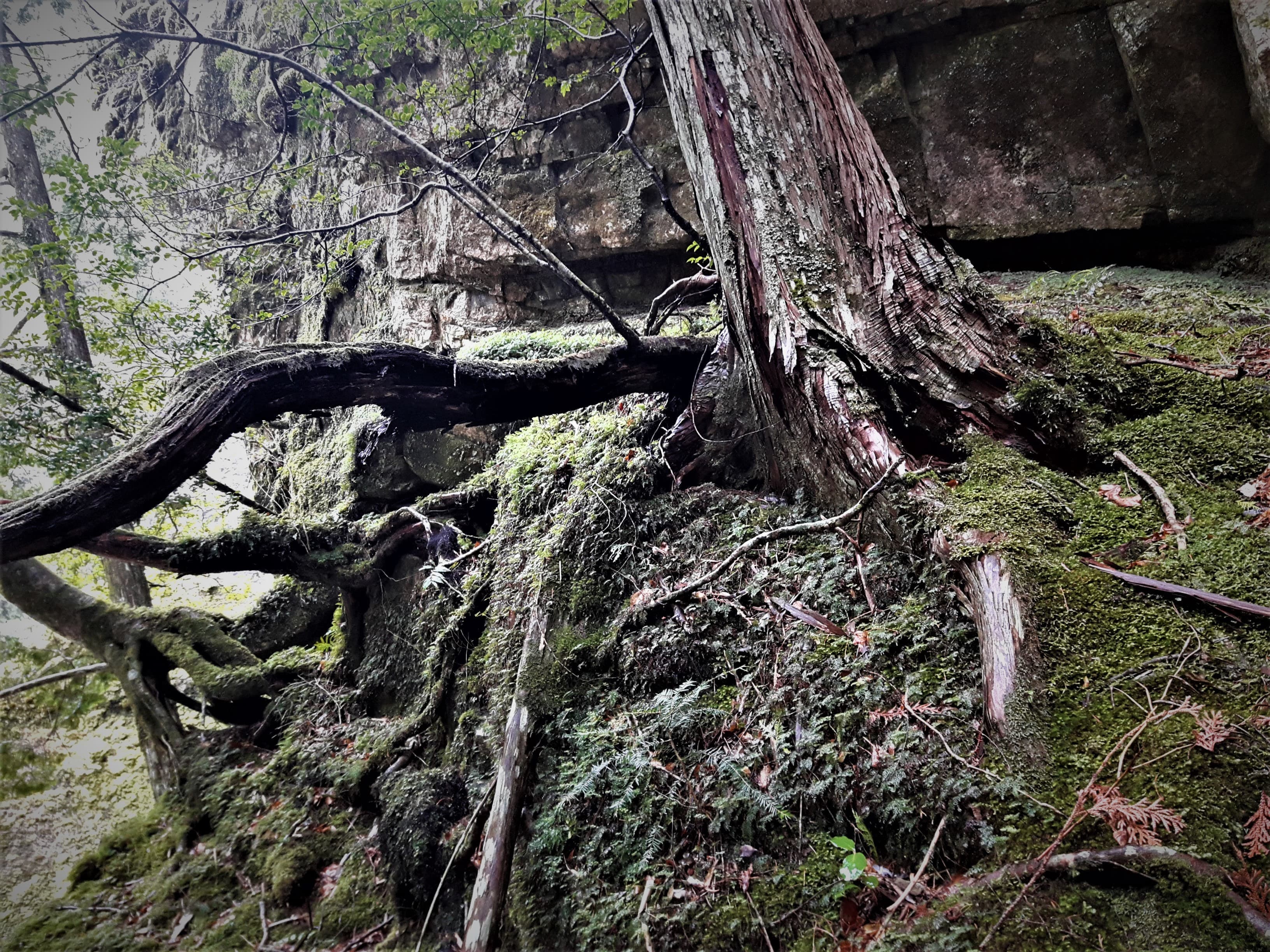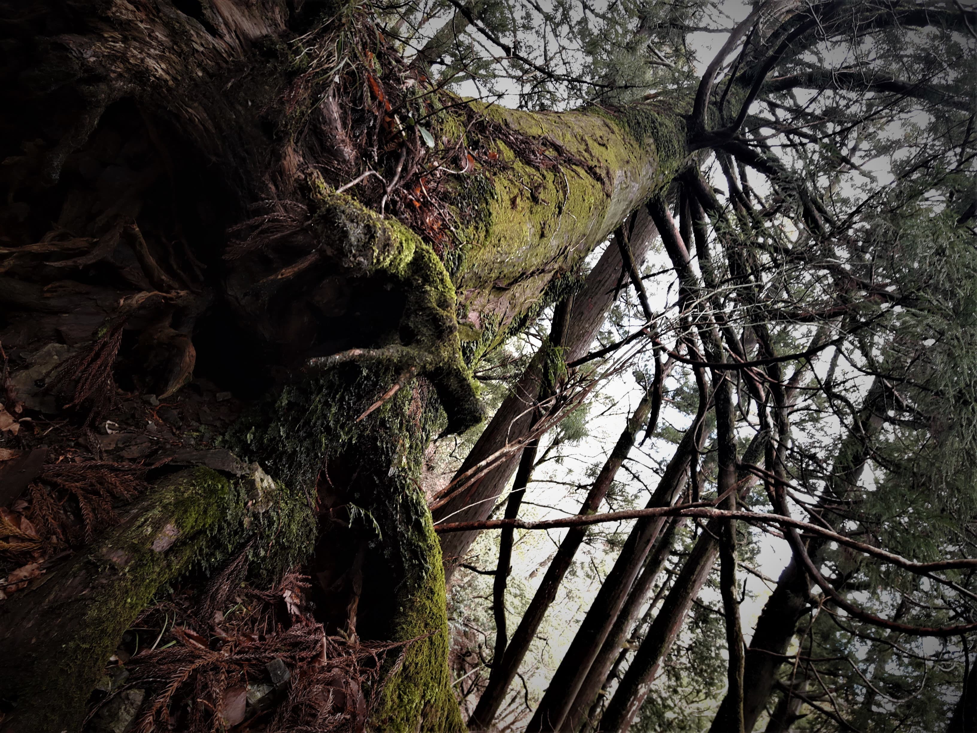ふと横を見上げると、今にも滑り落ちてきそうな大木が…