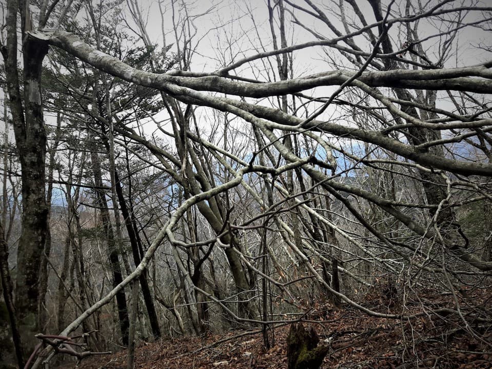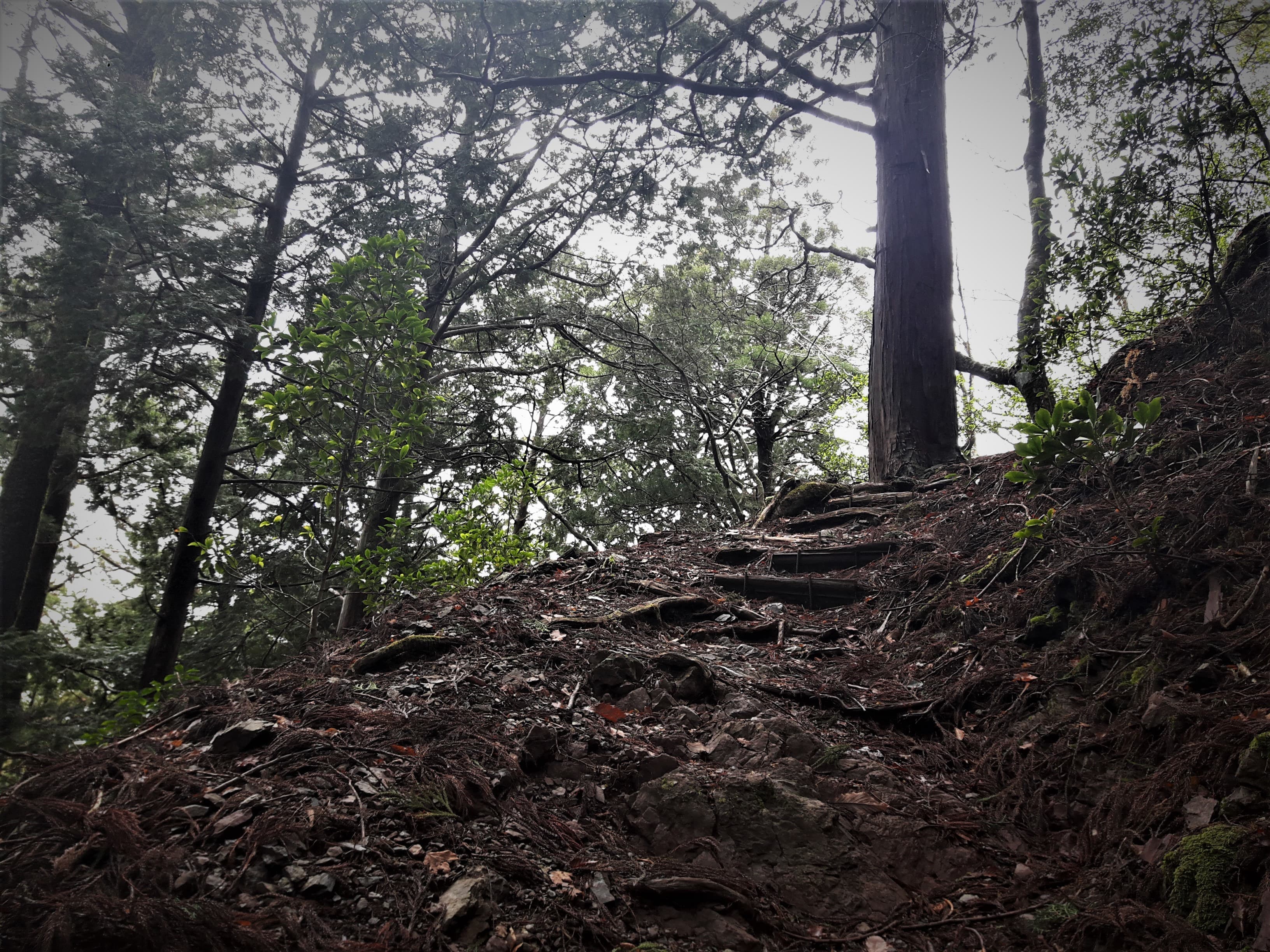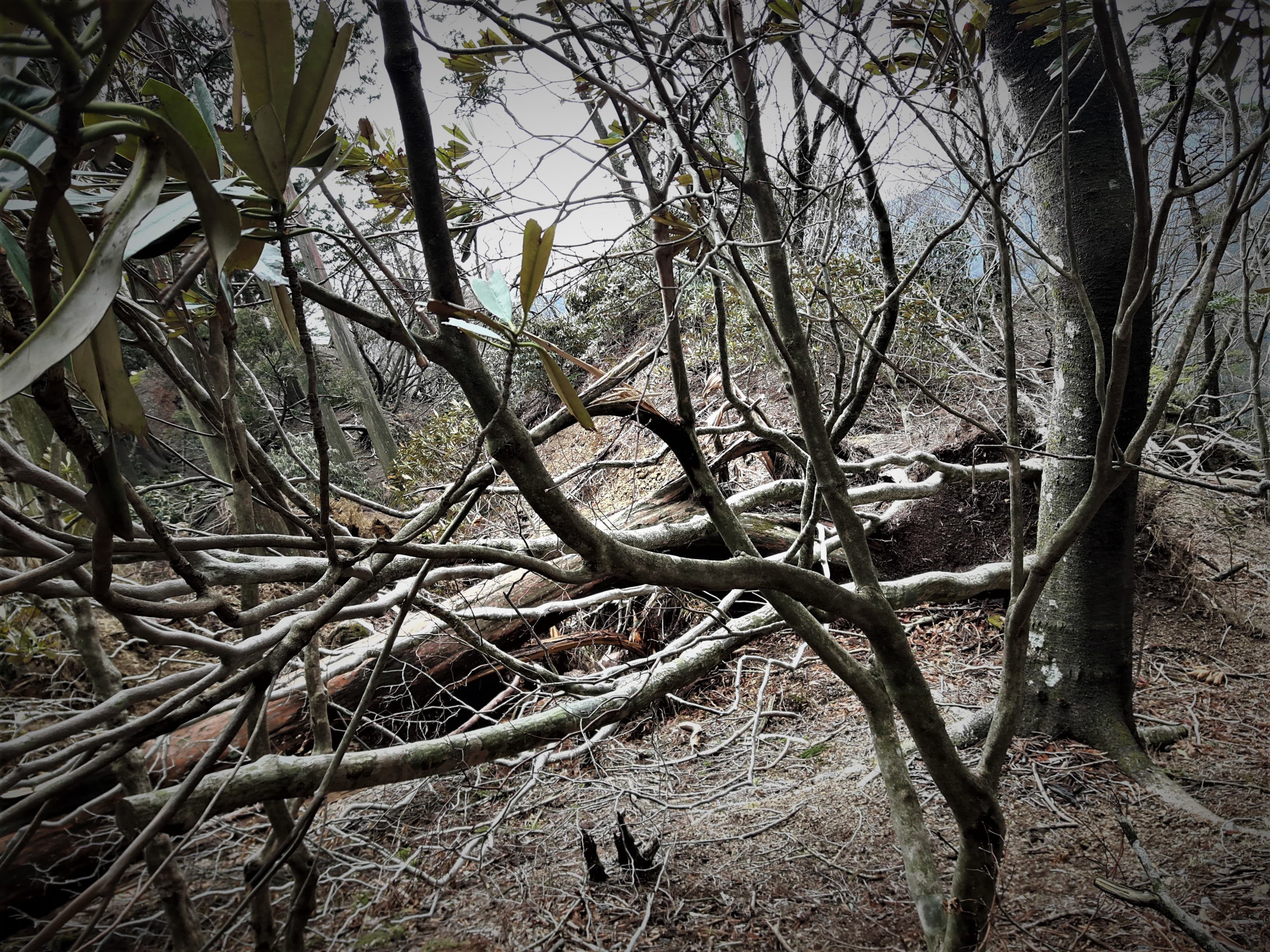 ふと横を見上げると、今にも滑り落ちてきそうな大木が…