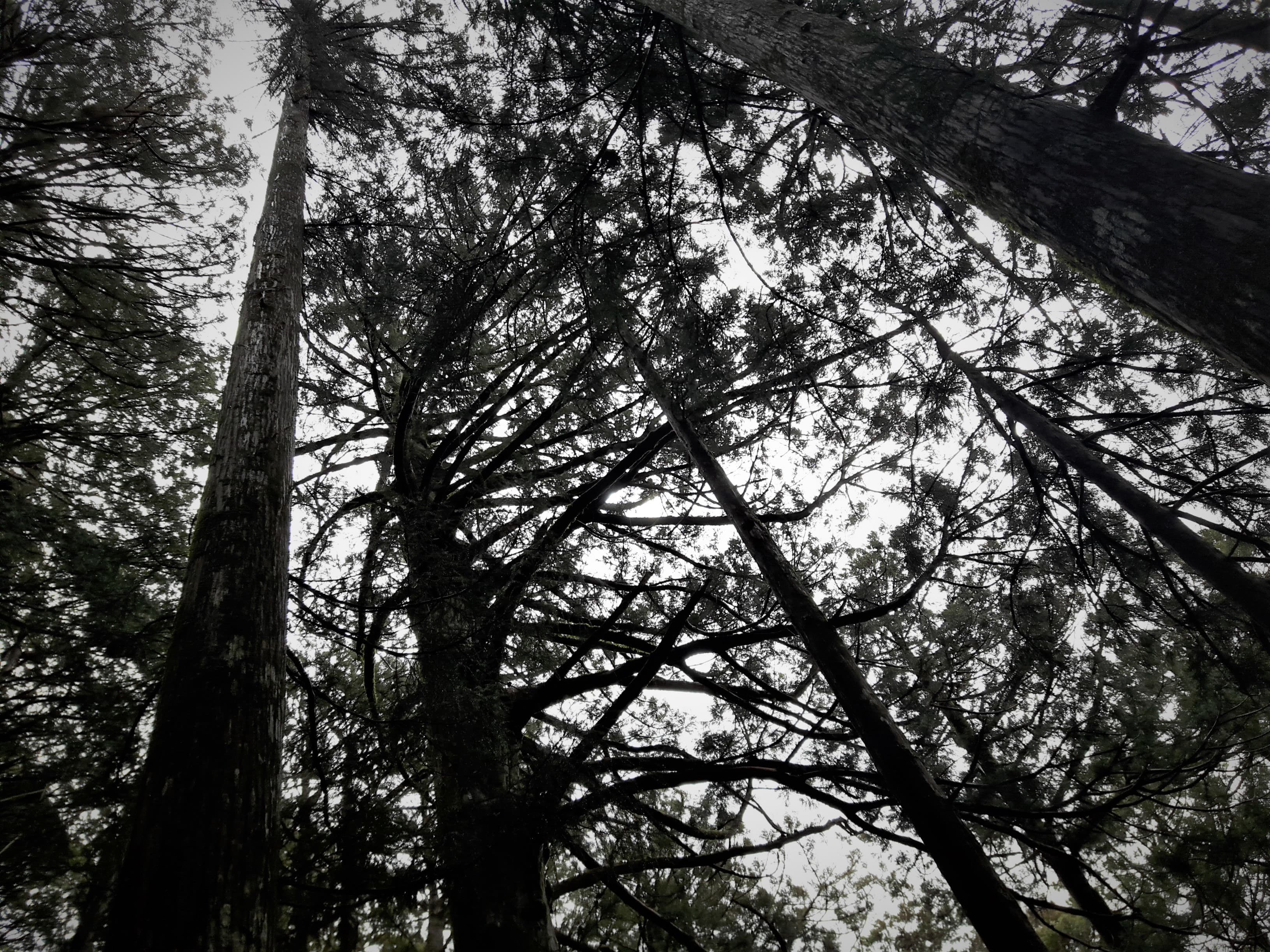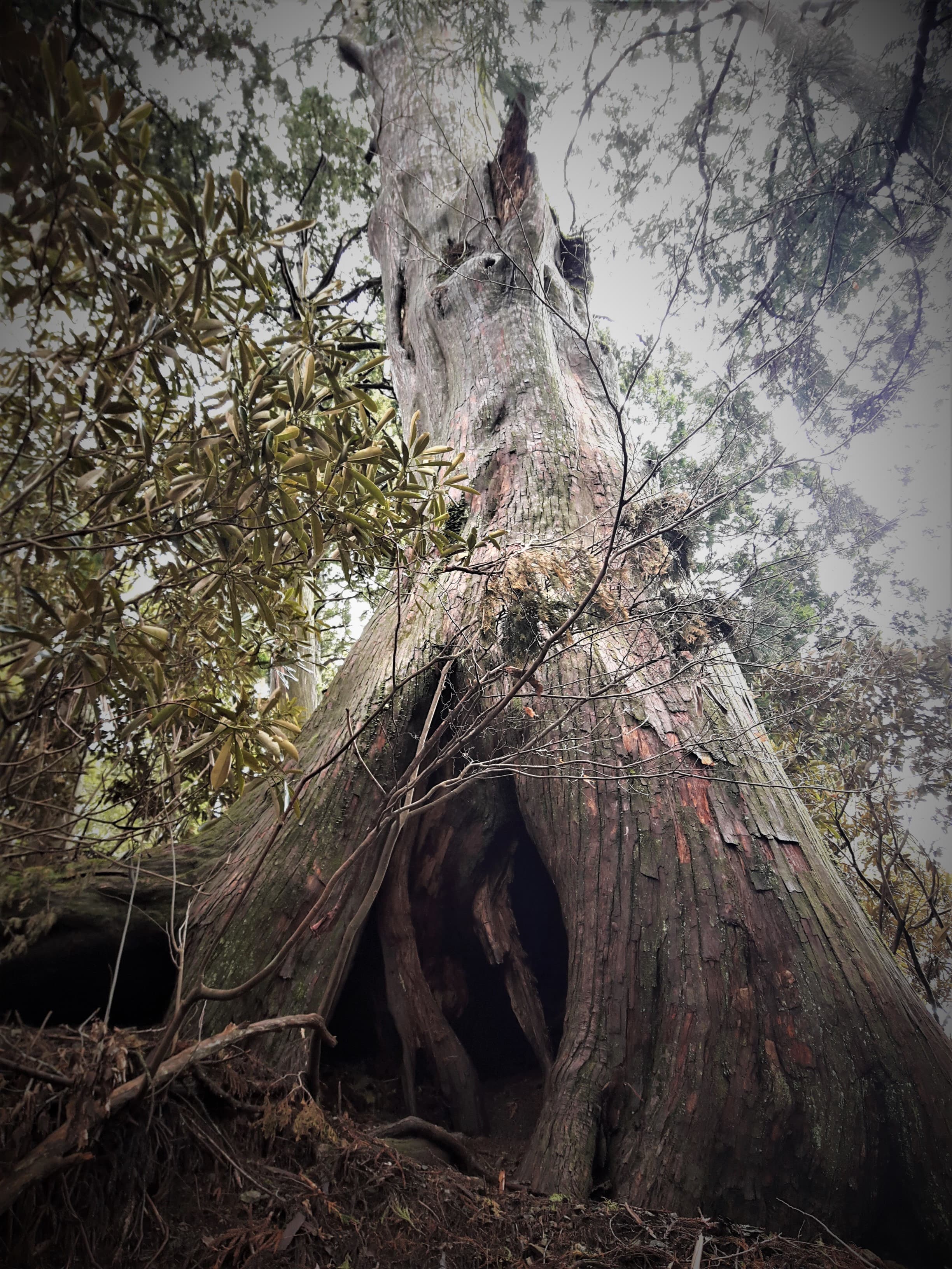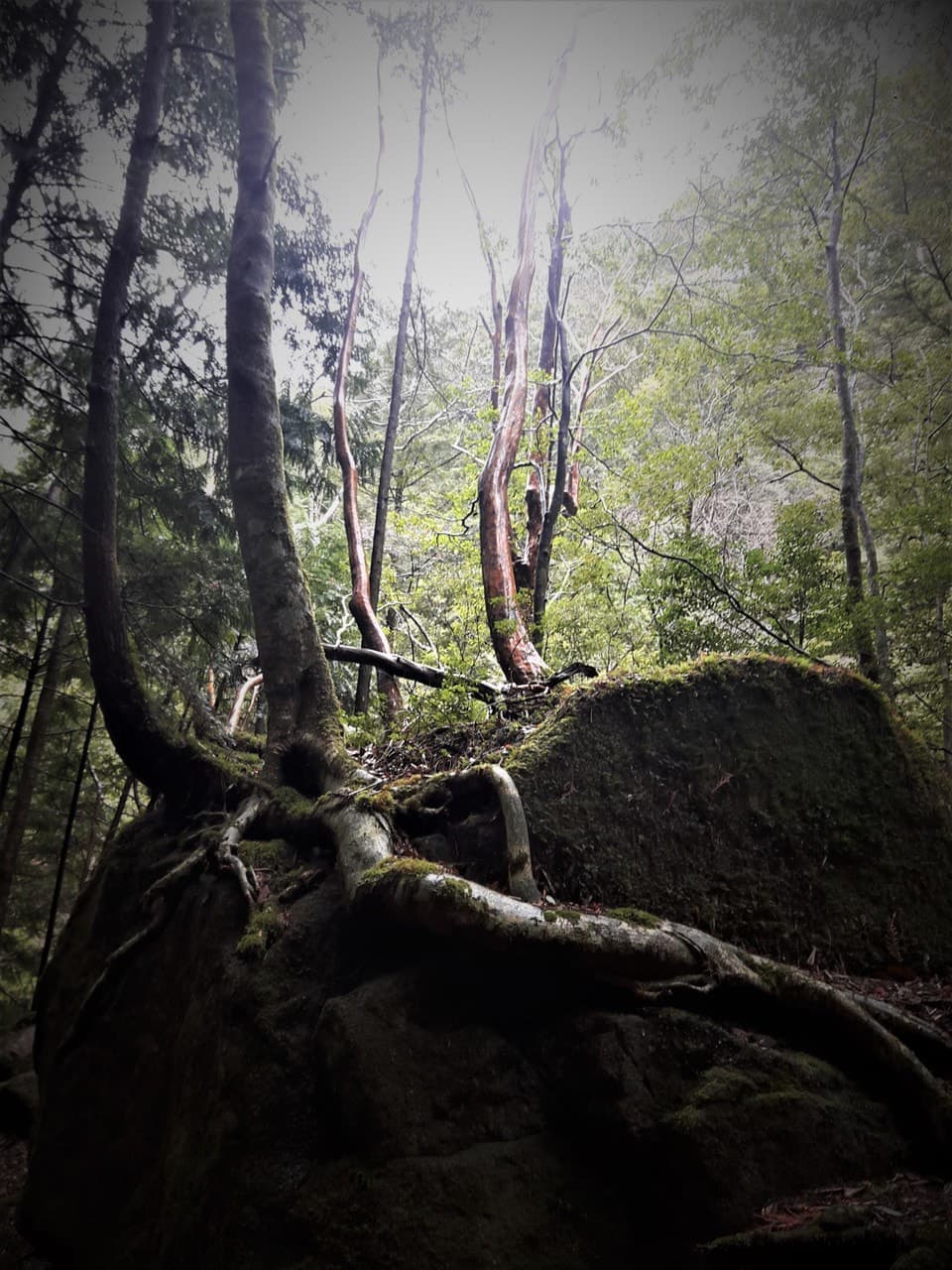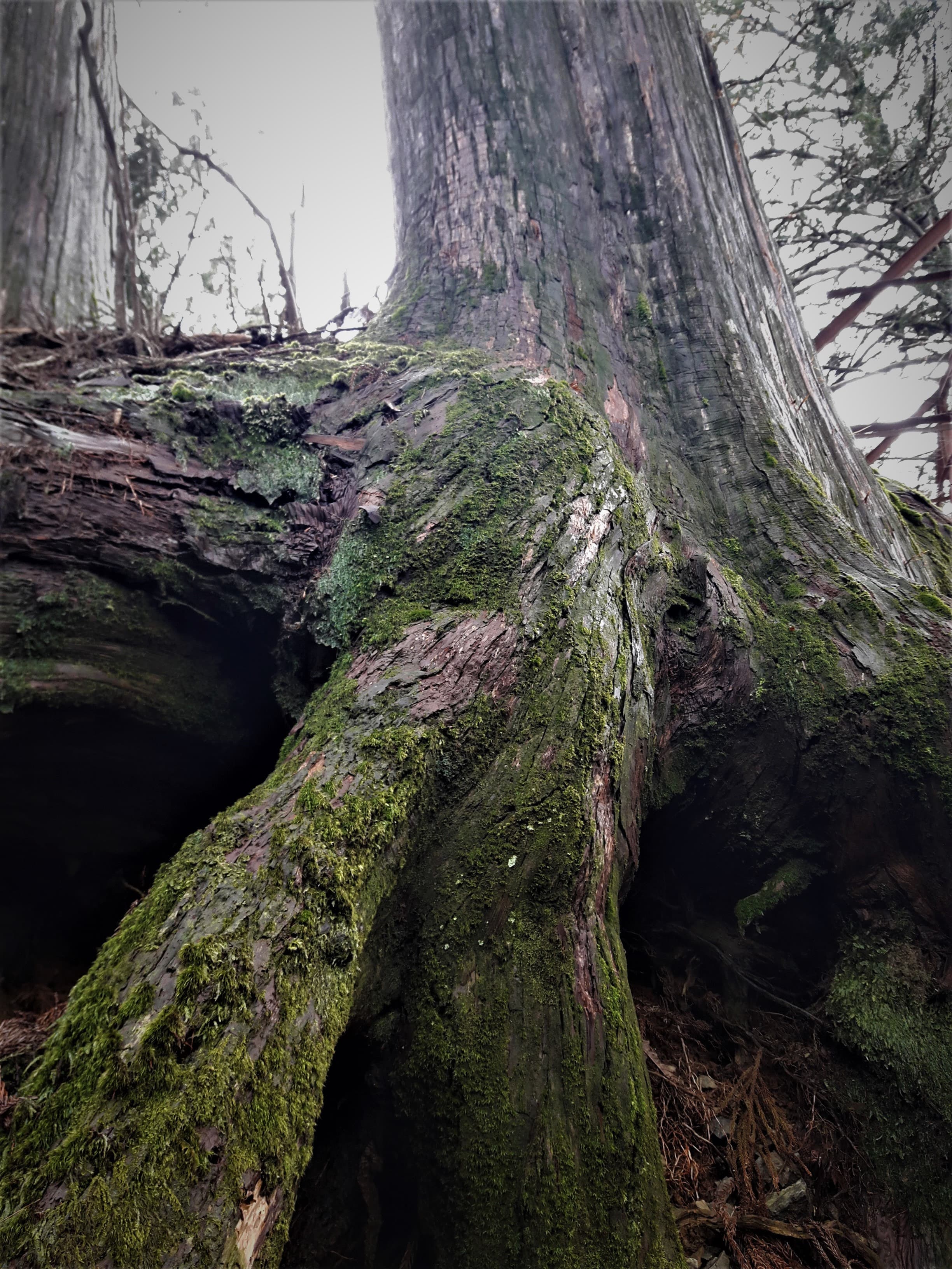 ふと横を見上げると、今にも滑り落ちてきそうな大木が…