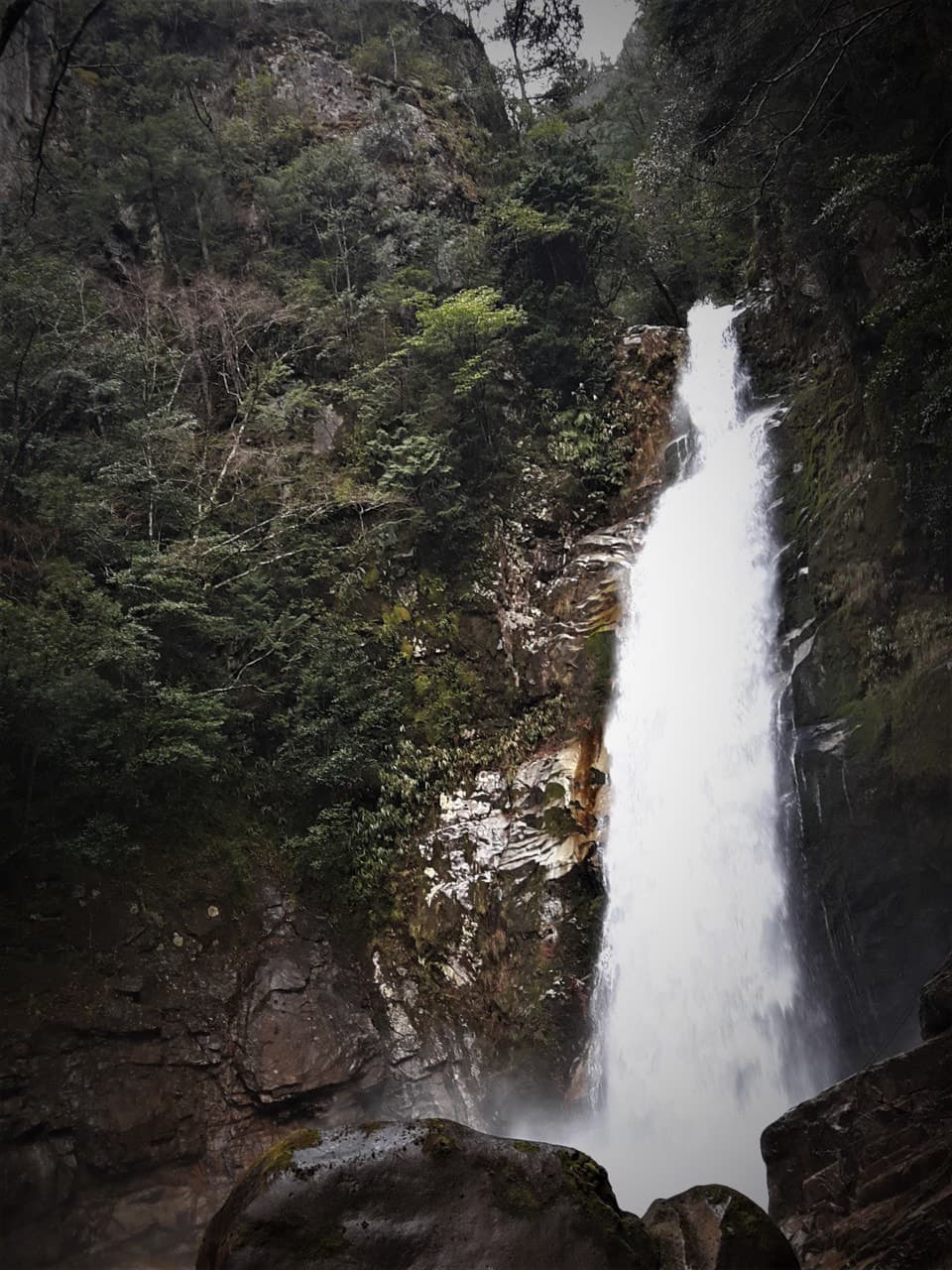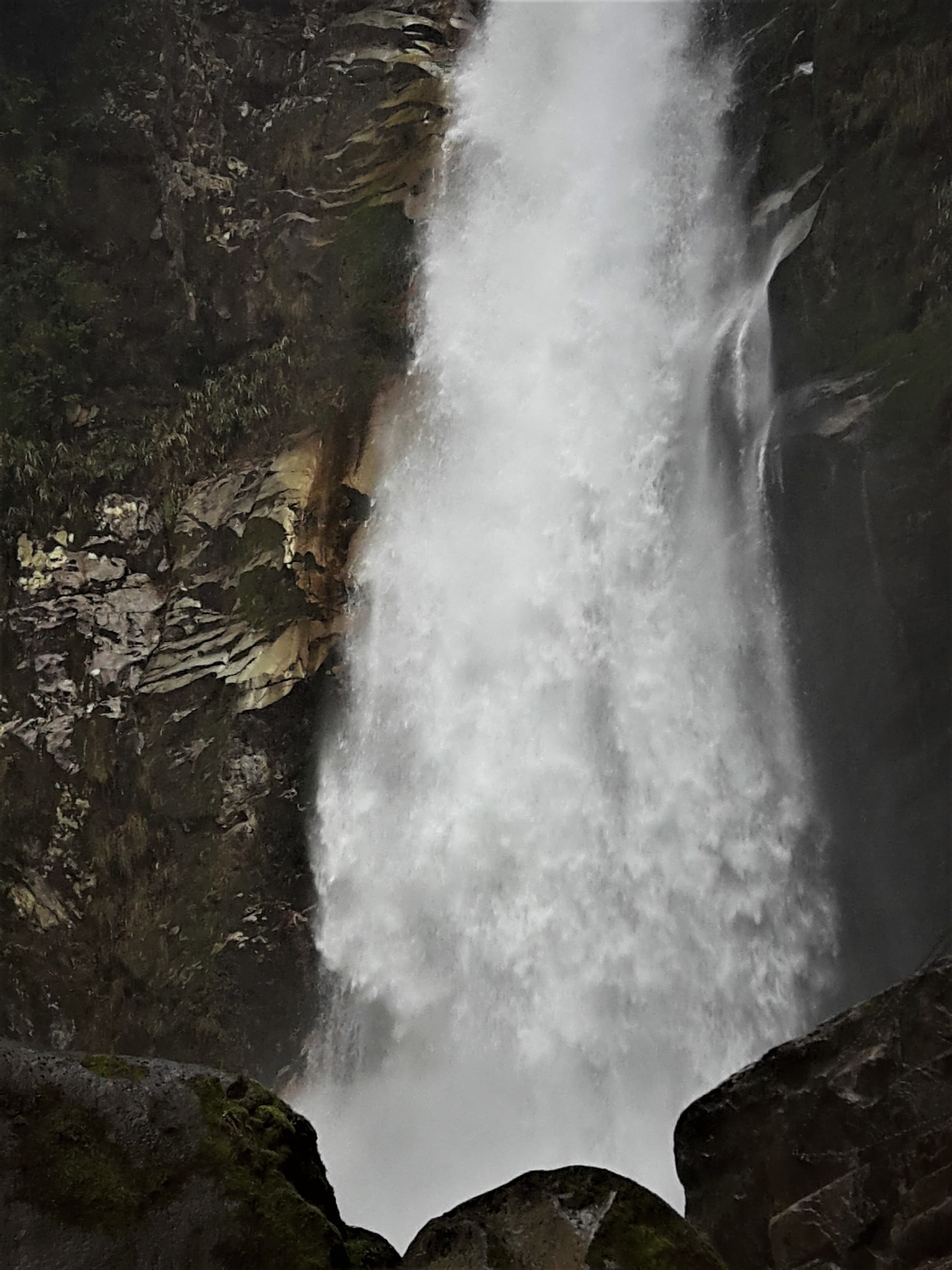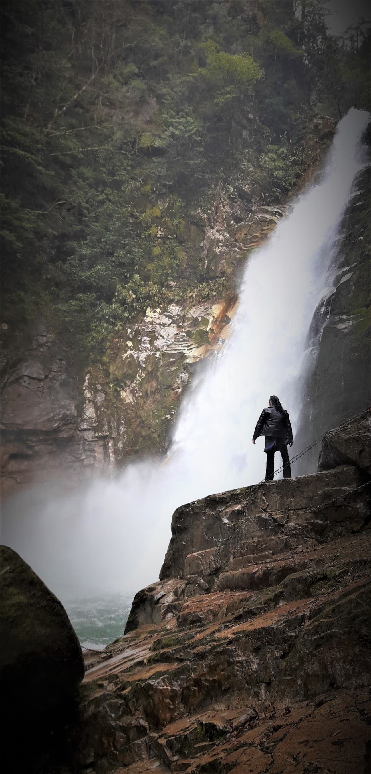 錆びた鎖を掴み岩肌に触れながら、一歩ずつ滝に近づきます。