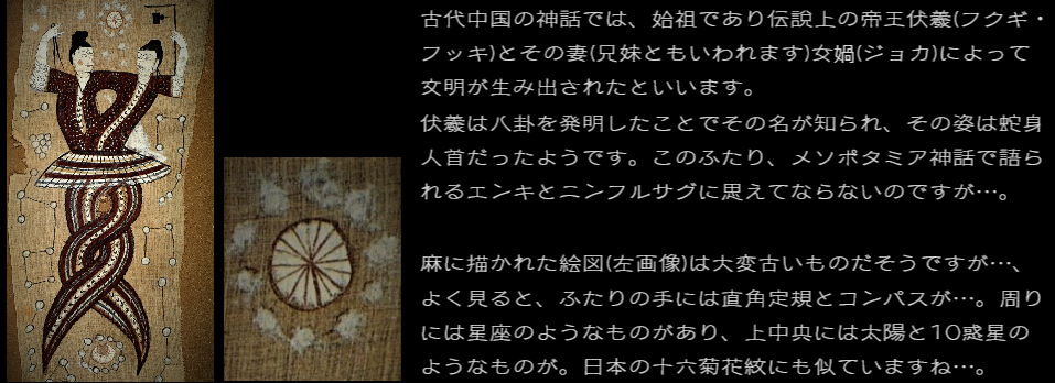伏羲と女媧が被っている帽子、そして蛇身人首。